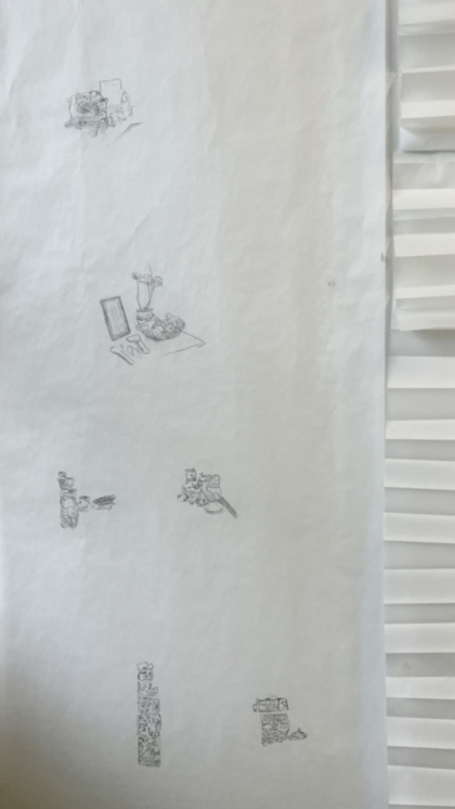 Hanaa's works serve as documentations of memory and loss within everyday spaces. She uses drawing, prints and text in layers as a means of storytelling to map out remnants of absences in once-occupied spaces.