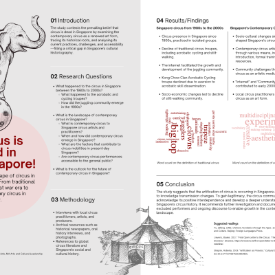 With an MA in Arts and Cultural Leadership from LASALLE College of the Arts, she aims to contribute further to the Singapore circus community, address the scarcity of circus literature, and formulate a comprehensive circus policy.